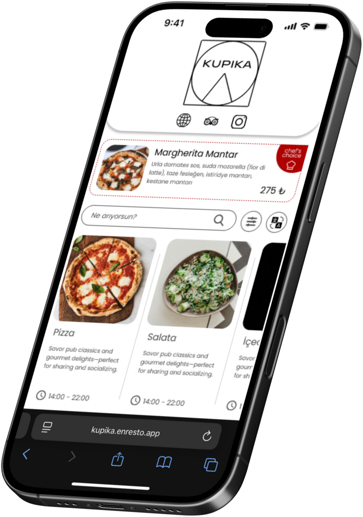 Menünüz, deneyimin bir parçası. Enmenu, yemek listesinin ötesine geçerek markanızı yansıtan bir deneyime dönüşmesini sağlar. Özelleştirilebilir QR kodları, öne çıkan ürün vurguları, müşteri yorumları ve dinamik pop-up görselleriyle menünüz daha işlevsel, daha dikkat çekici.